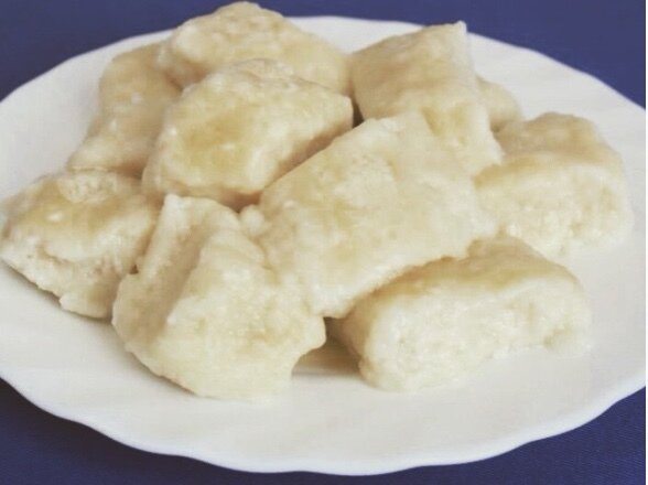 Тесто должно получится вмеру тугое, и его раскатываю колбаской, от которой нарезаю кусочки.