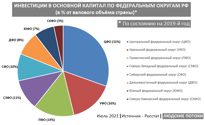 Если мы хотим узнать, в каких регионах у нас имеются перспективы, то, в первую очередь, надо изучить сколько инвестиций в них идёт. Поэтому, на этот раз, я решил провести такое исследование по регионам страны. В частности, здесь будут представлены валовые данные инвестиций в основной капитал (взятые на Росстате), а также рассчитанные мной подушевые показатели. Начну с валовых данных по федеральным округам и по регионам. Вот, в частности, по федеральным округам: На первом месте конечно же находится ЦФО с долей 31%, куда входит Москва, на которую приходится половина от этой доли (см. диаграмму ниже). Ну а на втором месте УФО, в состав которого входят богатые нефтью и газом Ханты-Мансийский и Ямало-Ненецкий автономные округа (ХМАО и ЯНАО). Далее, вот соответствующая диаграмма по регионам: Москва здесь в безоговорочных лидерах, причём в неё инвестируется примерно столько же, сколько в 46 самых отстающих регионов вместе взятых (всего в России 85 регионов). Так же Москва обгоняет по этому по