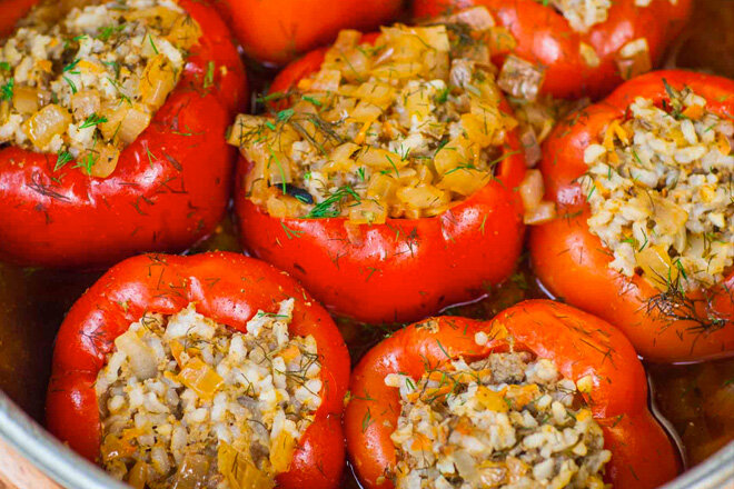 Как можно разнообразить повседневное блюдо? Конечно же приготовить его в красках! Например, готовить фаршированный перец мы будем готовить в разноцветных перцах - желтый, красный и зеленый. Будет невероятно вкусно! Вам понадобится 1. Цветные перцы - 6 штук 2. Фарш - 1 кг 3. Средняя морковь - 2 штуки 4. Красный лук - 1/2 штуки 5. Соус Наршараб - 3 столовые ложки 6. Соль, перец - по вкусу 7. Моцарелла - 1 большой шар 8. Твердый сыр - 100 грамм 9. Рис - 1/2 стакана 10. Томаты в собственном соку - 1 большая банка (граммы не помню) 11. Минеральная вода - 1/2 стакана 12. Копченая паприка - щепотка Инструкция 1. Подготавливаем перцы. Для этого моем, срезаем с них шапочку и очищаем от всех внутренностей и перепонок. Остатки перца на крышечках срезаем и мелко нарезаем. Если перцы очень крупные, то перед тем, как фаршировать, их можно окунуть в кипящую воду на одну минуту. Не больше, иначе раскиснут. 2. Рис отвариваем до готовности, промываем и оставляем в кастрюле остывать. 3. Морковь трем на т