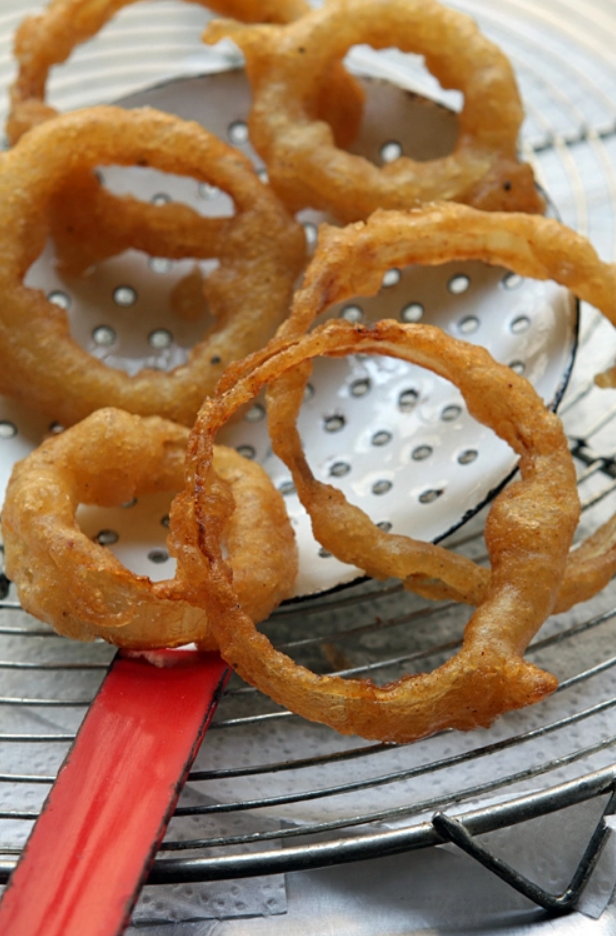 Ингредиенты: Приготовление: 1. Смешайте муку (или муку с кукурузной мукой) в миске и добавьте пиво, черный и красный перец и соль. Накройте и дайте постоять один час при комнатной температуре. 2. В широкой кастрюле или сковороде нагрейте масло примерно на 5 см до температуры 180ºC. 3. Насыпьте немного муки на тарелку и, работая порциями, бросьте 5 или 6 колец лука в муку, затем окуните каждое в жидкое тесто, стряхивая излишки, затем по одному опускайте их в горячее масло. 4. Обжарьте кольца лука в течение нескольких минут, переворачивая их ложкой с прорезями или другой посудой с отверстиями, пока они не подрумянятся с обеих сторон. Снимите и положите на бумажные полотенца или на решетку для охлаждения над бумажными полотенцами, чтобы они высохли. Пока он теплый, солим луковые кольца. Продолжайте обжаривать остальной лук таким же образом. Ешьте немедленно. Друзья, если вам понравился рецепт - подпишитесь на канал, а также оставляйте ваше мнение в комментариях. Мой YouTube: https://www.