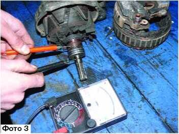 Наша задача - проводить все необходимые электроизмерения до обнаружения неисправности. В первую очередь, следует проверить наличие напряжения питания на реле - регуляторе генератора. Может, нет зарядки потому, что предохранитель перегорел. Проверка работоспособности самого реле-регулятора может состояться только при наличии дополнительного источника питания с регулируемым выходным напряжением, но об этом позже. Если есть подозрение на неисправный генератор, следует произвести серию измерений авометром, после чего дефектная деталь, как правило, обнаруживается. Проверяем сопротивление обмотки ротора (фото 2).