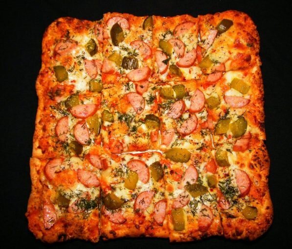 Сочетание колбасы и маринованных огурчиков с нежным сыром - отличное. Пицца получается в меру острая, в меру соленая, к тому же, сырно-сливочная. Ингредиенты: Как приготовить 1. Приготовим тесто. Смешать в миске просеянную муку с разрыхлителем. 2. Затем сделайте углубление в муке, влейте туда оливковое масло и воду. Замесите тесто. Оно должно быть эластичным. 3. Сыр нужно натереть или нарезать тонкими полосками. 4. Нарежьте колбасу тонкими кружочками. 5. Раскатайте тесто. Из указанного количества ингредиентов получится пицца на стандартный квадратный противень. Примерно так и раскатывайте, получится около 0,5 см толщиной. 6. Тесто выложите на застеленный пергаментной бумагой противень. 7. На тесто выложите томатное пюре. 8. Сверху разложите кружочки колбасы, нарезанные кружочками огурцы и сыр. 9. Выпекайте пиццу с огурцами и колбасой в разогретой до 190 градусов духовке около 15 минут. 10. Готовую пиццу с огурцами и колбасой посыпьте укропом. Пицца с огурцами и колбасой гото