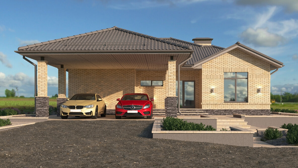 Навес для машин можно совместить с забором, как обычно это часто бывает. Цвет крыши выбран нейтральным серым, чтобы подходил к любому оттенку стен. Оставив машину под навесом поднимаемся на крыльцо и входим в тамбур, в котором располагается мебельная ниша для шкафа. Слева вход в котельную. Также присутствует уборная на входе. Общая зоны кухни и гостиной - открыта для всех. 3 спальни имеют ванную и одна из них свою собственную. Из кухни имеется выход на задний двор. Окна не стали делать белыми, а выполнили в тон крыши. Цвет кирпича распространенный и максимально везде встречающийся. Местами украшаем дом кирпичом и подсветкой. В виде отделки цоколя - заложили серый сланец.