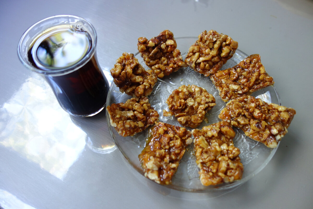 Что получилось, и почем все-таки нужен сахар Вчера обнаружила в шкафу баночку старого меда, который надо было куда-то применить. Поэтому докупила немного грецких орехов и решила сделать то, что давно хотела – ореховые козинаки. С козинаками из кунжута я уже достаточно хорошо подружилась – они получаются легко и непринужденно. Поскольку процесс приготовления сладости с грецким орехом ничем не отличается, можно посмотреть это видео. Правда, есть один нюанс. Кунжут мелкий, семян много, поэтому он спокойно застывает, даже если в мед не добавлять сахара. Дробленый грецкий орех склеивается хуже, поэтому на полстакана меда лучше добавить 3-4 столовые ложки сахара. Расплавленный сахар, как известно, застывает до твердого состояния и не липнет к рукам. Эти свойства передаются и козинакам :) Состав: Сначала в стальной сковороде с толстыми стенками расплавляю мед и сахар, довожу до золотисто-коричневого цвета. Добавляю предварительно измельченные орехи (просто раскатывала скалкой). Перемешиваю, д