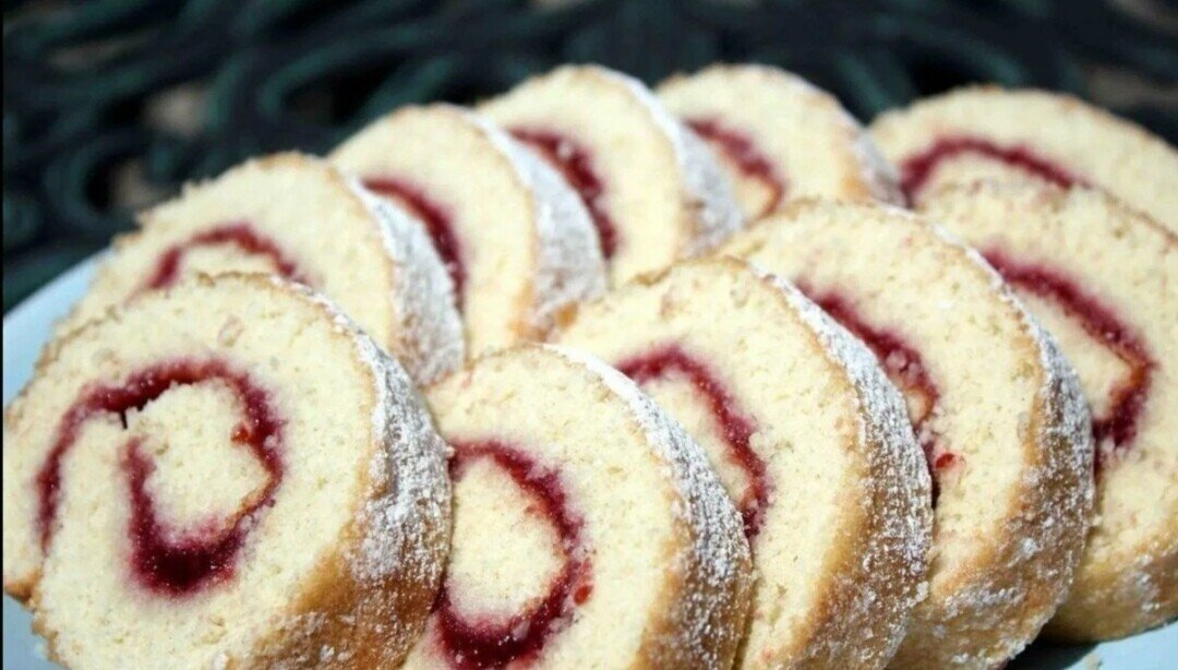 Мука-55гр, сахар - 55гр, щепотка соли, разрыхлитель -2 ч л , яйцо- 2 шт, любой джем или варенье. смешать муку,сахар, соль, разрыхлитель. Добавить яйца, вымешать. Тесто должно быть как густая сметана. Н а противень застелить пекарскую бумагу, смазать маслом, выложить тесто. выпекать примерно 6-8 минут. Горячим свернуть в рулет в полотенце. на остывший рулет намазать начинку, свернуть. можно посыпать сахарной пудрой.