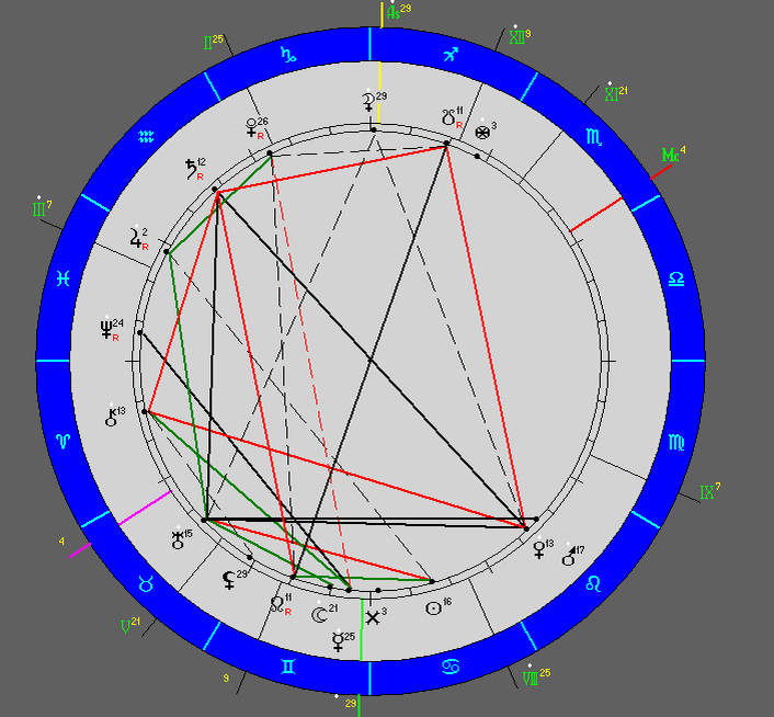 Асцендент первого дома в конце знака Стрельца, под управлением ретроградного Юпитера в Рыбах из второго дома.