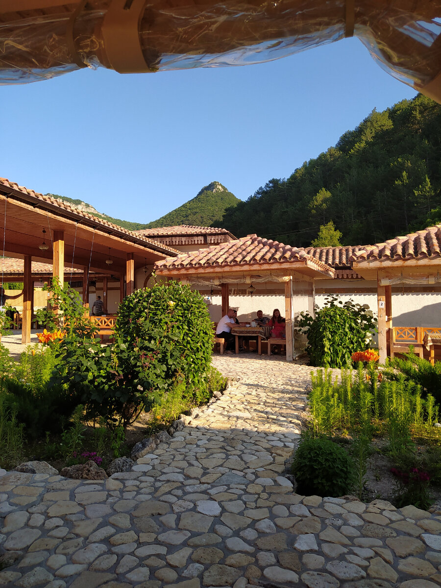 У подножия Мангуп-Кале есть несколько очень атмосферных татарских кафе Мы иногда заезжает сюда поесть традиционной татарской еды. Раньше ели чебуреки, но что-то организм стал бунтовать против чебуреков, поэтому, мы перешли на янтыхи. Они не такие жирные. Последнее время нам полюбилось кафе "Ана-Юрт". Это новое кафе. Кафе очень красивое. Тут красивые клумбы Мы сели за стол с видом на озеро Вот меню. Можете сами посмотреть, какие тут цены. Цены выросли за последнее время..А зарплаты наши, к сожалению, нет... Янтыхи по 150₽/шт. Мне одного хватило, чтобы наестся....Два я бы не осилила. Но все мои родственники взяли по 2 Я очень люблю лагман. И раньше он стоил 200₽, сейчас- 300₽. Мне жалко 309₽ за суп))) Я , видимо, стала жмотом))) Решила, что дома сварю лагман. И за 300₽ у меня выйдет целая кастрюля))) После кафе мы решили пройтись по сувенирным лавкам Раньше, в моем детстве, тут ничего не было...Сейчас тут - небольшое татарское село Ходжа-Сала В сувенирной лавке купили специи для лагман