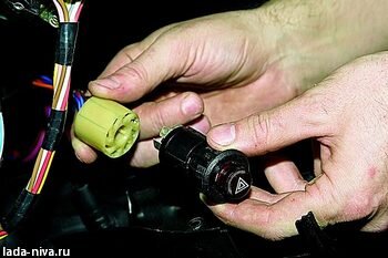 Снятие выключателя аварийной сигнализации (кнопка аварийки) Снимаем нижнюю часть кожуха рулевой колонки (см. тут). Отсоединяем колодку проводов от выключателя аварийной сигнализации и снимаем его. Устанавливаем выключатель аварийной сигнализации в обратной последовательности. Подрулевой переключатель и его замена Цепи, включаемые подрулевыми переключателями Рычаг переключателя света фар (1) (напряжение в цепь фар подается при включении клавиши переключателя наружного освещения на панели приборов во второе положение):
