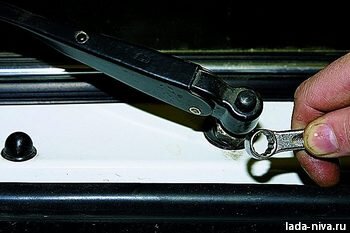 Отсоединяем «минусовой» провод аккумуляторной батареи. Снимаем очиститель ветрового стекла для замены моторедуктора или деформированных деталей рычажного привода. Для снятия поводка… …ключом «на 10» отворачиваем гайку его крепления. Покачивая, снимаем поводок. Если поводок снимается туго,… …можно воспользоваться ключом «на 17», действуя им как вильчатым съемником. Для снятия очистителя ветрового стекла снимаем оба поводка. Ключом «на 21» отворачиваем гайку крепления втулки рычага к кузову. Снимаем уравнитель… ...и резиновую прокладку. Аналогично освобождаем втулку другого рычага.