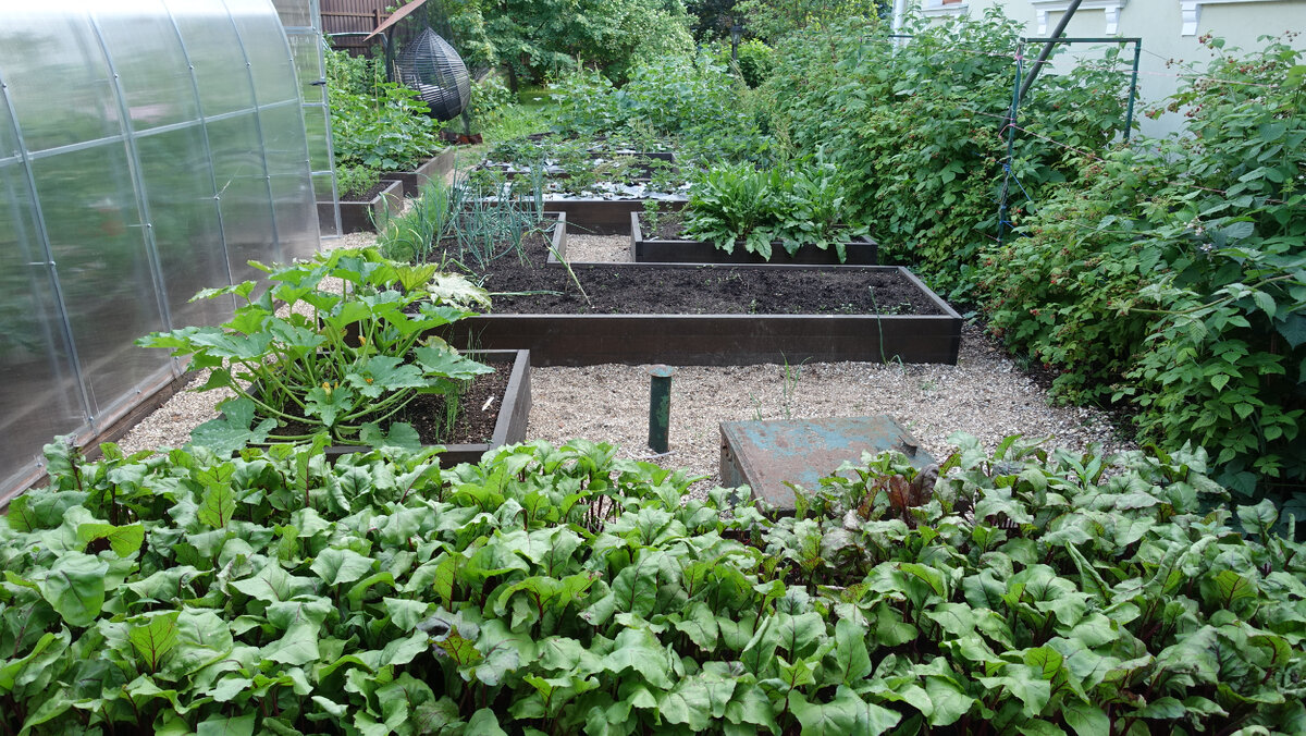 Принято писать о том, как все вокруг все делают неправильно. Я не поддерживаю эту традицию, и даже когда я писала о том, как соседи приводят в порядок свой старый участок, даже намека на то, что надо делать как мы, а не как они, у меня не было. Вот и сегодня я покажу вам чудесный огород, которого у нас нет и никогда не будет. Но это очень милый огород и мне очень нравится по нему бродить. Огород скрыт от дома пристройкой, поэтому ни от дома, ни во время прогулок в саду (а часть участка лесная) огород не видно. Грядки сделаны из дерева, приподняты сантиметров на 30 и наполнены грунтом. Древесина обработана, чтобы не гнила, и покрашена. Между грядок - мульчивание. На геотекстиле толстый слой мелкой гальки. Справа на этой фотографии малинник, с одной стороны его ограничивает стена, а с другой вкопан бордюр. Теплица на участке одна из поликарбоната. В ней растут томаты, перцы и баклажаны. А в ногах у них зелень: лук, базилик и шпинат. В начале лета здесь же росли редиска и укроп. Капу