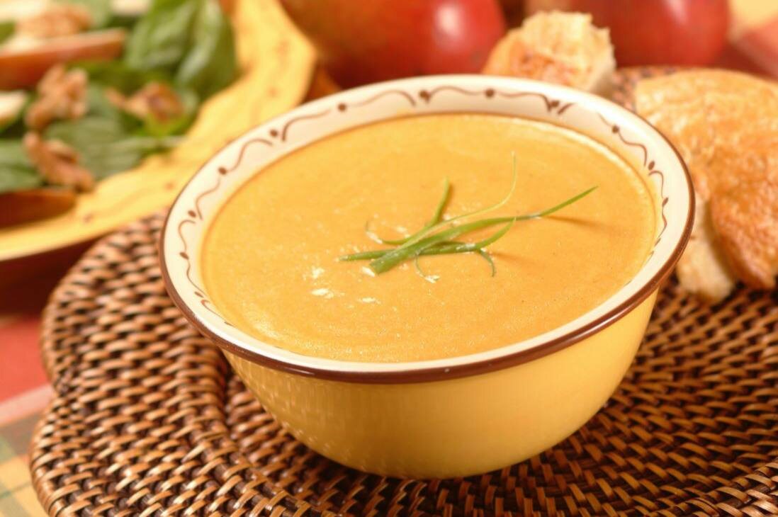 Тыква такой овощ, который может подстроиться под любую специю. Овощное карри - это одно, а вот тыквенный суп со вкусом карри - это совершенно другое. Очень интересный сладковатый вкус. Кокосовое молоко в рецепте можно заменить на сливки. Нам понадобится: ▪️тыква 600-800 г ▪️кокосовое молоко 400 мл ▪️бульон 500 мл ▪️корень имбиря 20 г ▪️креветки 10 шт ( можно использовать овощи или бекон) ▪️розмарин пару веточек ▪️карри, соль, перец по вкусу ▪️чеснок 3 зубчика 1. Нарезаем тыкву и отправим запекаться с розмарином, сбрызнув оливковым маслом на 40 минут при 180 гр 2. Нарезаем тыкву на небольшие кубики и мелко измельчаем имбирь, затем обжарим на оливковом масле. 3. Далее приправим тыкву карри, солью и перцем, хорошенько перемешаем и готовим пару минут. 4. Затем добавим кокосовое молоко, бульон, снова перемешаем, доведём до кипения и пробьем все блендером. 5. Креветки очистим и обжарим с измельченным чесноком до румяной корочки. 6. Подаем, положив вниз креветки, а сверху украсив зеленью и