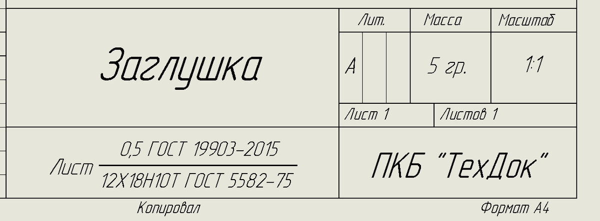 6) простановка дроби в записи. Текст в поле записи:Лист <STACK size=0.9>0,5 ГОСТ 19903-2015<OVER>12Х18Н10Т ГОСТ 5582-75 </STACK>