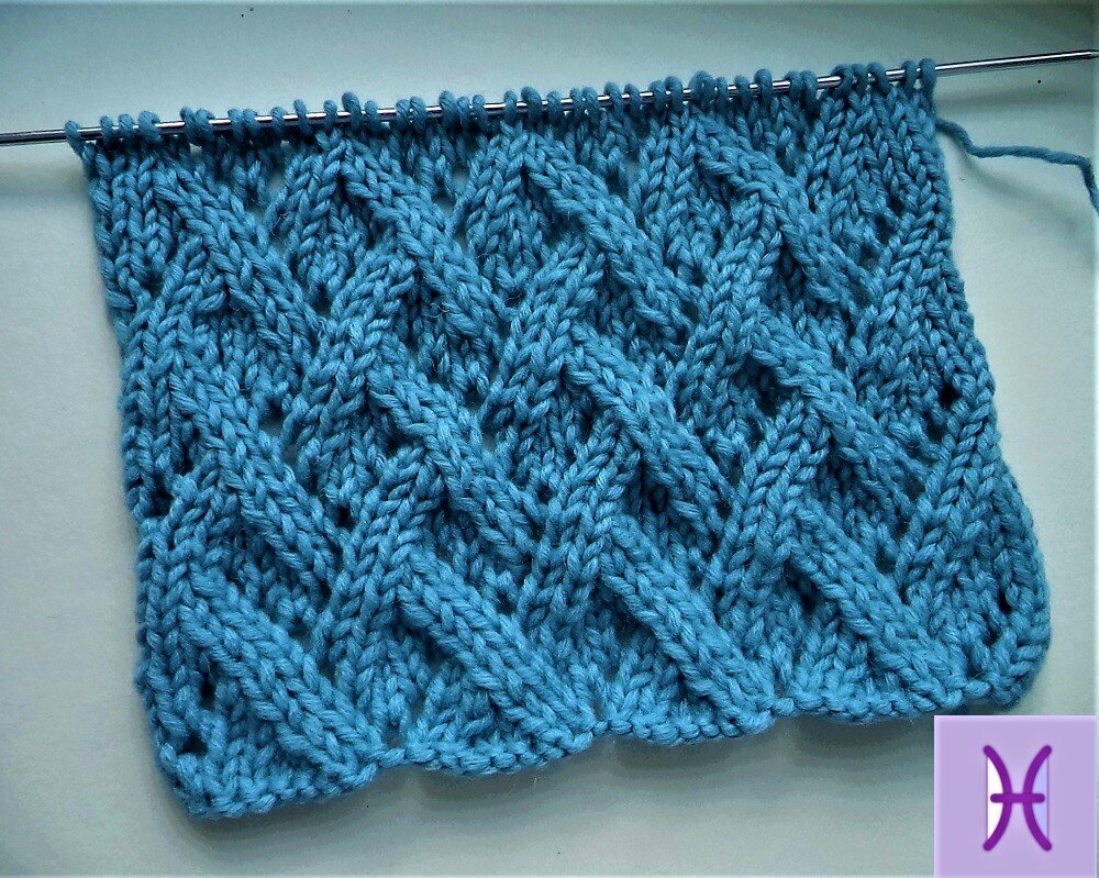 В превеликом множестве различных узоров большое место занимают узоры с различными переплетениями. Сегодня я снова хочу показать подобные узоры. Но в этих узорах линии переплетаются по диагоналям. Получаются очень интересные рисунки. Узор 1 Узор ажурный. Прекрасно подойдет для вязания летних плечевых изделий - кофточек, маечек. Описание вязания узора: Раппорт узора равен 8 петля по ширине и 12 рядам по высоте вязания. Количество петель в наборе должно быть кратно 8 плюс 4 петли для симметрии плюс 2 кромочные петли. 1-й ряд: кромочная, 1 лицевая, 2 вместе лицевой с наклоном вправо (за передние стенки), 1 лицевая, накид, 1 лицевая, *2 вместе лицевой с наклоном влево (за задние стенки), 2 лицевые, 2 вместе с наклоном вправо, 1 лицевая, накид. 1 лицевая, * 2 вместе лицевой с наклоном влево, 5 лицевых, кромочная 2-й ряд и все четные ряды: вяжутся изнаночными 3-й ряд: кромочная, 2 вместе с наклоном вправо, 1 лицевая, накид, 1 лицевая, накид, * 1 лицевая, 2 вместе с наклоном влево, 2 вместе с