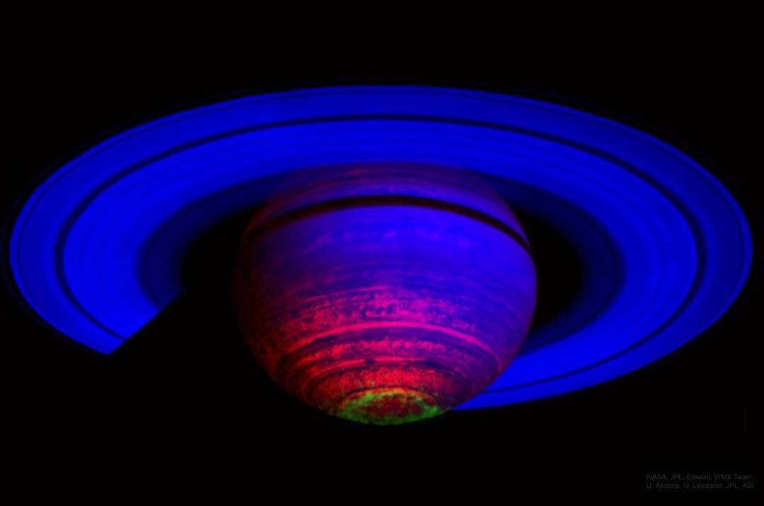 Чтобы выяснить это, ученые просмотрели сотни снимков Сатурна, полученных космическим аппаратом «Кассини» в инфракрасном диапазоне. Они были сделаны для других целей, однако среди них можно было найти изображения полярных сияний, позволяющие проследить за их изменениями и создать фильмы. Сатурнианские полярные сияния меняются не только в зависимости от угла падения солнечных лучей, но и по мере вращения планеты. Более того, некоторые изменения связаны с волнами в магнитосфере Сатурна, создаваемыми его спутниками. Эта фотография была сделана в 2007 г., на ней представлены три диапазона инфракрасного излучения. Кстати увидеть полярные сияния там можно только в инфракрасным диапазоне ,не вооруженным глазам сияния не видны, так как атмосфера Сатурна состоит в основном из водорода. Кольца отражают относительно голубой солнечный свет, а планета светится красным светом с более низкой энергией. Полоса южных полярных сияний показана зеленым цветом. Недавно было обнаружено, что полярные сияни