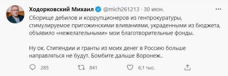 Видный борец за «открытую Россию будущего» Ходорковский явно психанул. И в гневе объявил, что прекращает свою «благотворительную деятельность» в России. Вот так. Осерчал отец родной, оставил без куска хлеба тысячи и тысячи активистов, представителей «гражданского общества» и просто людей с хорошими лицами. В гневе МБХ написал у себя в твиттере: В общем, «денег нет, но вы там держитесь». Что его так разозлило? А то, что Генпрокуратура РФ признала нежелательными на территории России деятельность иностранных неправительственных организаций (НПО), в том числе: - «Фонд Будущее России» (Великобритания); - «Европейский выбор» (Франция); - «Фонд Ходорковского» (Великобритания); - «Оксфордский российский фонд» (Великобритания). Все как на подбор! Что это означает? А то, что тысячи «активистов» в России у ее границ не получат стипендии и гранты, не будут ездить в Литву на «семинары», перестанут участвовать в акциях «гражданского общества». Останутся без стабильной зарплаты и рабочих виз в ЕС. По