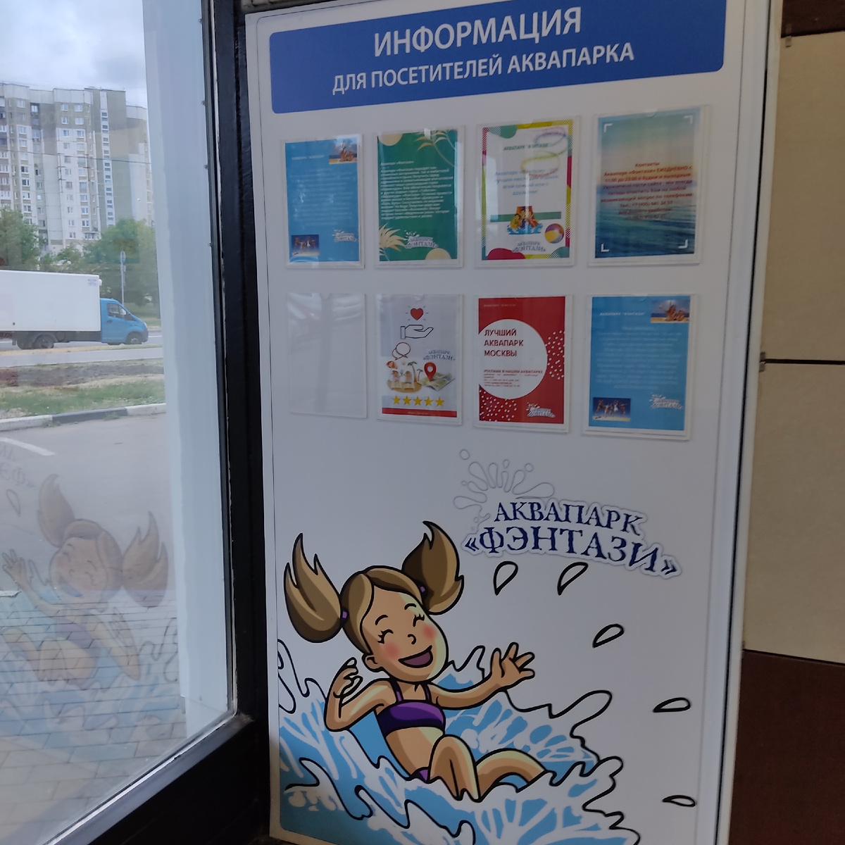 В аквапарке "Фэнтази" г. Москва, были ещё до ремонта, лет 8 назад. И тогда, я вам скажу, ощущение было не из приятных. В бассейнах присутствовал неприятный запах от воды, горки были старые и требовали ремонта, раздевалки небольшие. Ночью в аквапарке проходили всякие взрослые вечеринки и после этого дети с утра шли купаться в воду, чистота которой оставалась под вопросом. Аквапарк долгое время был закрыт на ремонт. После ремонта распахнул свои двери уже обновленный, чистый. По случаю Дня рождения друга моего сына, мы дружной веселой компанией, мамы и детишки, отправились на целый день в аквапарк. Живём неделако, 10 минут ходьбы от дома и мы в аквапарке. Входные билеты покупали используя скидочный купон. На сайте купонов можно преобрести выгоднее, нежели покупать в самом аквапарке. На входе нас встретил охранник, проверил сумки, напомнил про маски и попросил надеть бахилы (бахилы и маски в бесплатном доступе в специальных контейнерах). В просторном холле располагались фотоотдел, д
