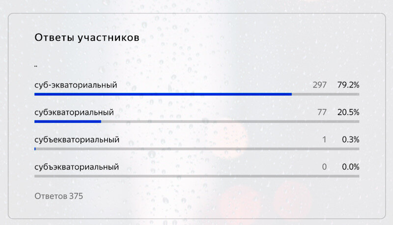 Кстати, в одном из наших предыдущих тестов «антигероем» стало слово «субэкваториальный», 79,2% респондентов не смогли определить правильное написание этого слова, решив написать его через дефис. Ну а мы переходим к нашему нынешнему тесту. Итак, как правильно? Ставьте 👍 палец вверх, если справились с большинством слов без ошибок.