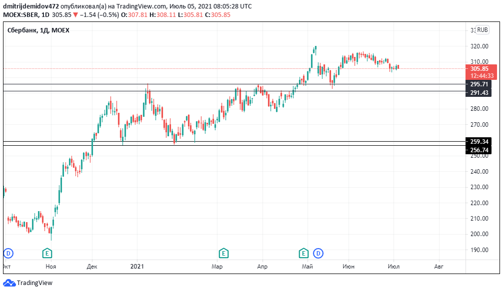 Российский фондовый рынок открылся гэпом вверх, но тут же в начале первого часа торгов на Мосбирже индекс РТС вернулся к закрытию предыдущей торговой сессии. Возможно так негативно повлияло на рынки новость о том, что международные инвесторы выводят средства с российских фондов и во втором квартале вывели около 121 млн долларов. В чем здесь логика? Выводят ли деньги из-за опасения санкций или еще чего-то – вы сможете узнать в этом обзоре, в конце, где я подведу свою мысль на этот счет. Акции Cбербанк: Пройдемся по голубым фишкам и посмотрим, что ныне теперь происходит. Сбербанк РФ с того места, как мы в последний раз делали обзор не двинулся выше. Поэтому, по Сберу тишина пока продолжается, но мы заранее помним зоны и уровни, откуда стоит откупать акции банка. Ценность данной голубой фишки уверен, что вам объяснять не стоит, но если кто-то забыл, то вот кратенькое напоминание. Самый крупный банк РФ, создание и развитие своей экосистемы, которая начинает приносить деньги и поддержка пра