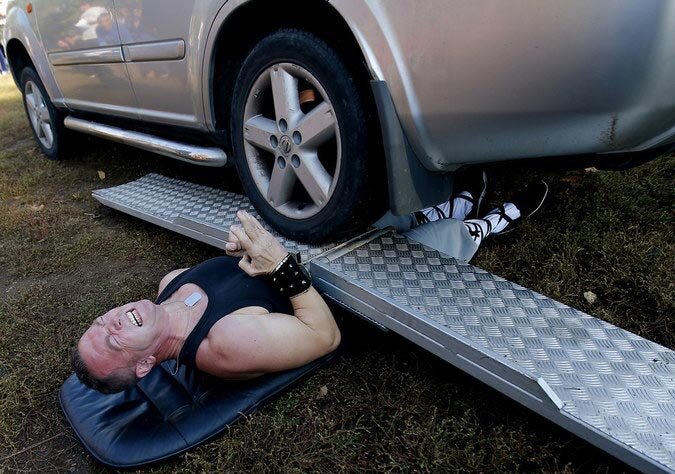 21 октября 2012 года в Венгрии парня по имени Аттила Баньяи переехал джип 5 раз 16 мая 2015 года более 40 студентов Сибирского федерального университета втиснулись в одну машину, побив тем самым мировой рекорд Крис Уолтон под псевдонимом "Герцогиня" установила мировой рекорд по самым длинным ногтям в мире 14 сентября 2011 года. На тот момент длина её ногтей составляла 3,1 м на левой руке и 2,9 м на правой Японский модный дизайнер Казухиро Ватанабе отрастил и поставил на своей голове ирокез высотой 113 см Милан Роскопф из Словакии подбросил и поймал 3 бензопилы 62 раза в июне 2009, побив тем самым свой предыдущий мировой рекорд, который составлял 35 раз