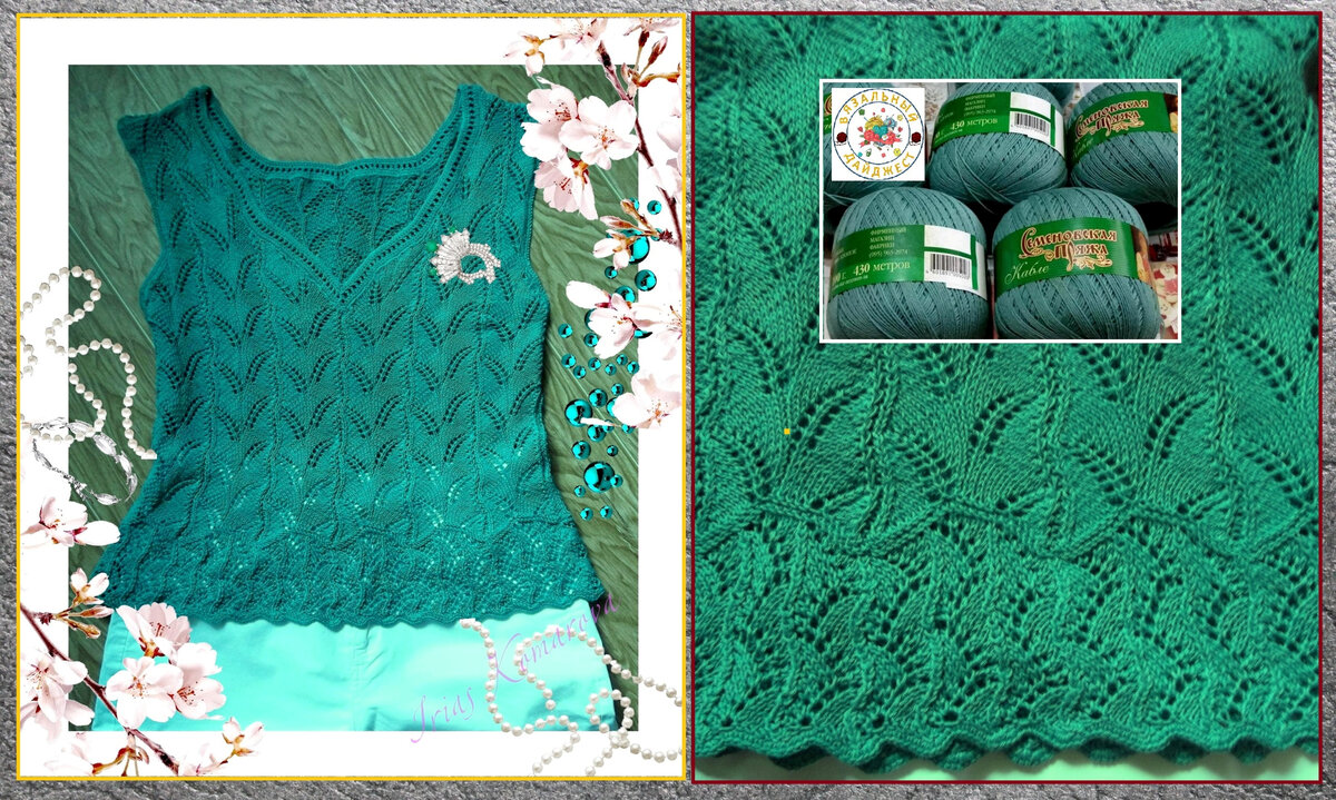 Продолжаются мои эксперименты по вязанию из хлопковой пряжи тонкими спицами №2. Перед вами летняя ажурная майка из хлопковой СЕМЁНОВСКОЙ ПРЯЖИ «КАБЛЕ» благородного зелёного цвета. Ну что сказать, для меня это самая комфортная и уютная вещица! Ношу её не только летом с шортами, брюками и юбками, но и как деловой вариант с костюмом под жакет.