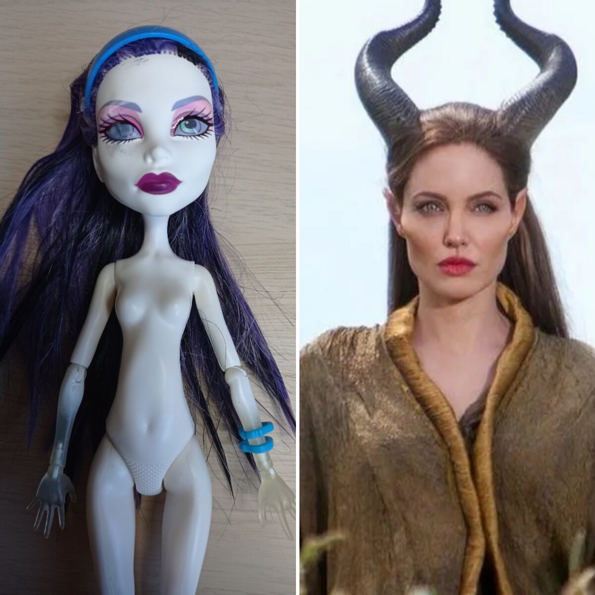 Всем привет! Меня зовут Александра, и я увлекаюсь преображением (ООАКом) кукол Monster High и Ever After High. Начинаю новый проект по переделке. И сегодня героиней рассказа будет Спектра Монстер Хай, которой предстоит превратиться в Малефисенту. Давно мечтала её сделать. Для этого проекта Спектра была выбрана не случайно - у куколки очень выдающиеся скулы, которые больше всего подходят для воплощения этого персонажа. У куколки есть небольшой изъян - бывшая хозяйка пыталась подрисовать глаз. После того, как я стерла заводской мейк, на меня посмотрел Терминатор)). После нескольких дней на солнце под Базироном пятно стало бледнее. Но полностью оно не исчезло. Я уже начала работу над куклой, но пока буду разбирать волосы на пряди, у куколки ещё будет пара дней позагорать, чтобы пятно стало ещё менее заметным. Остальное скроет роспись лица, тем более, что куколку буду тонировать в человеческий цвет. Итак, первое, что нужно было сделать - рога. Мне очень хотелась их сделать максималь