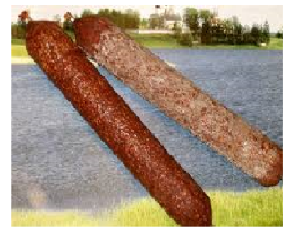Этот довольно неприятный признак потери качества товара возникает из-за того, что нарушаются условия хранения товара по влажности, из товара испаряется жидкость, оставляя после себя соль. Она и является этим налётом. Справедливости ради необходимо отметить, что уровень необходимой влажности должен быть в очень узком диапазоне - 75-78%. В реальности достигнуть этого невозможно. Поэтому колбаса с белым налётом фактически не является некачественным или небезопасным товаром, его можно и покупать и употреблять. Более того, в некоторой степени это признак очень хорошего продукта, он так созревает. Выглядит, правда, не очень, потому – решайте сами. В последнее время эта проблема производителями успешно решается за счёт дополнительной упаковки колбас в вакуумную полиэтиленовую оболочку, высыхания не происходит, налёт не появляется. Под налёт может маскироваться и плесень. Отличием на первых этапах появления от соли является её некоторое выступание над поверхностью колбасы, пушкообразная (от сл