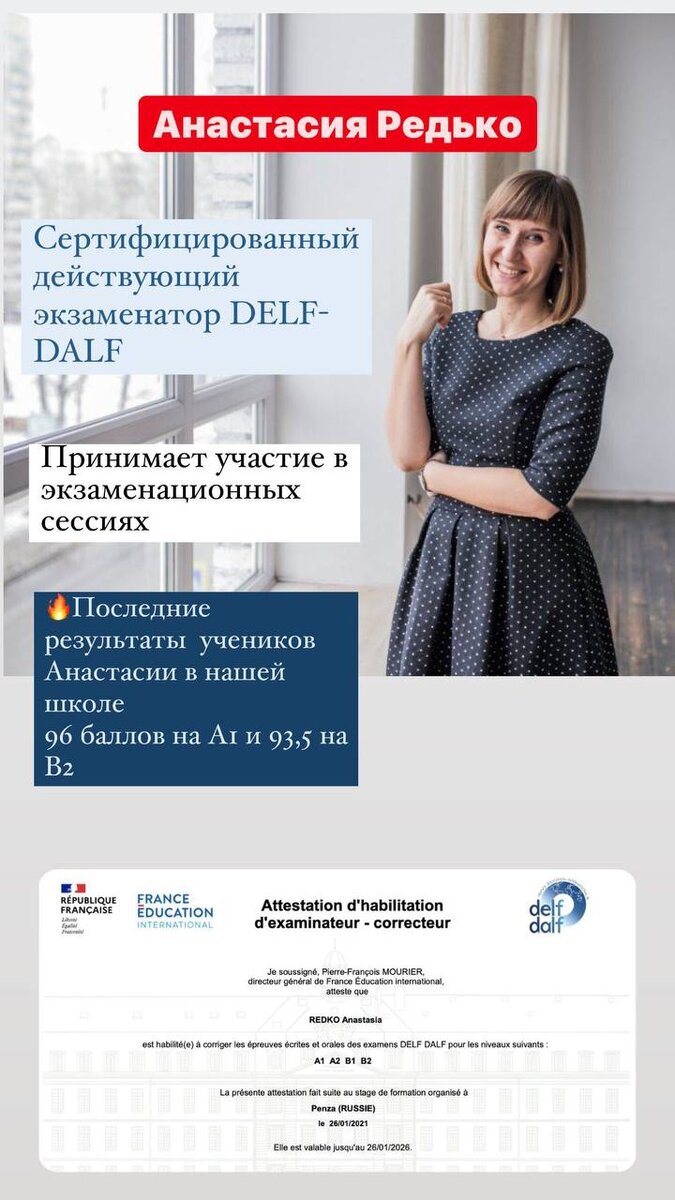 Вебинар от дипломированного экзаменатора. 07 июля в 17:00 мск. Анастасия Редько. Участие открытое 🙄О боже, мне этот экзамен никогда не сдать... такие мысли чато приходят к тем, кто планирует сдавать международныйэкзамен. И на этом вебинаре мы расскажем вам, как успешно сдать экзамен на любой уровень от А1 до С1, как подготовиться, на что обратить внимание, как не потерять баллы и набрать дополнительные и многое другое. "Добрый день! Меня зовут Анастасия Редько. Я преподаватель французского языка в Cocoécole, а также сертифицированный экзаменатор DELF-DALF. В течение 6 лет я готовлю к данному экзамену, а также принимаю участие в экзаменационных сессиях. Мои ученики сдают экзамены на разных уровнях от А1 до С1 со средними баллами от 80 до 90 и более. На майской экзаменационной сессии мои студенты в Cocoécole набрали 96 баллов на А1 и 93,5 баллов на В2. Приглашаю вас на вебинар, посвященный экзамену DELF-DALF. На вебинаре мы поговорим об организационных вопросах сдачи экзамена (уровни, с