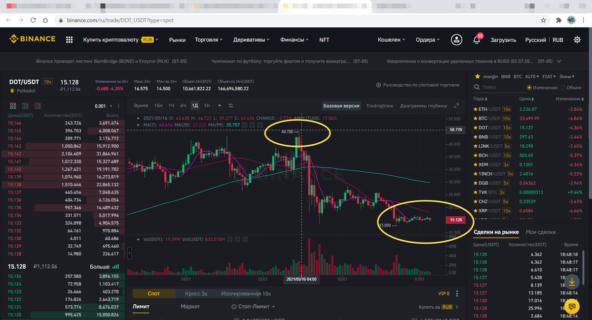 Топ не дорогих и перспективных монет для покупки. Сейчас криптовалютный рынок испытывает не лёгкие временна, но для знающих людей это время, когда можно стать богатым. Для этого нужно терпение и немного понимая мира криптовалют. Еще пару месяцев назад Биткойн стоил 60 тысяч долларов, сейчас его цена находится на отметки 30-35 тысяч долларов. Биткоин самый крупный актив на рынке и его падение вызвало падение всего рынка. Многие монеты упали на дно. И сейчас самое время их скупать, что и делают многие крупные инвесторы. Это не финансовый совет! Ваши деньги, ваша ответственность! Вам решать покупать эти монеты или нет. Я лишь хочу поделиться своим мнением. Желаю вам успеха в финансовых вопросах. 1. Polkadot Проект очень перспективный и быстро развивается. Цель - создать блокчейн в котором, будут объединены все блокчейны. Сейчас цена монеты 15-20 долларов, но в мае этого года цена достигала 50 долларов. 2. Solana Стоимость доходила почти до 60 долларов, а сейчас колеблется в районе 35 д