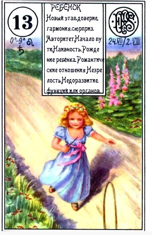 "Этот ребенок говорит о дружбе и приносит вам счастье, он восхваляет вашу собственную вежливость и вашу доброжелательность". Краткая интерпретация: ребенок, зачатие, начало нового, доверие, наивность, новый этап, старт. Открытые возможности, главное, ими воспользоваться, а не оставлять на потом. Новые перспективы и идеи, человек без накопленного опыта "зеленый" в каком-то деле, незрелость. Когда ? - в самом ближайшем будущем. Конечно, Ребенок точнее раскроется с соседними картами, всегда смотрите сочетания карт, но эта карта в любом случае сулит получение новых эмоций, опыта, впечатлений, новых моментов, ну и указывать может как на ребенка, так и на молодого человека. Запоминать все сочетания не нужно, это придет само собой, когда вы запомните и поймете каждую карту, а там уже начнете читать сочетания, как предложения, например, ребенок+сад = новая компания, новое общение и т.д. Сочетание с другими картами: КРЕСТ – незаслуженные страдания, наказание не по вине. ЯКОРЬ – несамостоятель