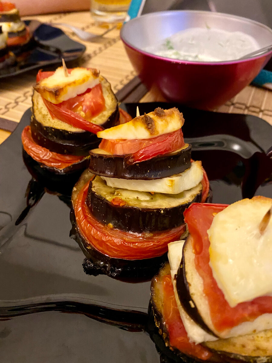 Сегодня готовим с вами баклажаны пармиджано, только с кавказским сыром. Баклажаны- 2 шт Томаты биф - 2 шт, либо 500 г помидоров Сыр кавказский умалат/сулугуни- 250 г Соль/перец - по вкусу Чеснок - 4 зубчика (я заменила на чесночную приправу) Для соуса: До консистенции жидкой сметаны смешать айран с кефиром, у меня была пропорция 1:1, добавить мелко измельчённые укроп и кинзу по 2 веточки. Чеснок мелко порубить, либо пропустить через чеснокодавилку, натереть им баклажаны, нарезанные кольцами, все посолить, поперчить и оставить минут на пять. А пока займемся другими ингредиентами. Помидоры и сыр нарезать кольцами. Противень смазать маслом, постелить пергамент, его я смазала оливковым маслом. Далее строим башни: баклажан-помидор-баклажан-сыр-баклажан-помидор-сыр, у меня получилось 10 таких башенок. Выпекать в духовке, разогретой до 180 градусов в течение 30-35 минут. Подавать можно с моим вариантом соуса, греческим йогуртом, сметаной, либо ореховым соусом. Приятного аппетита 😋