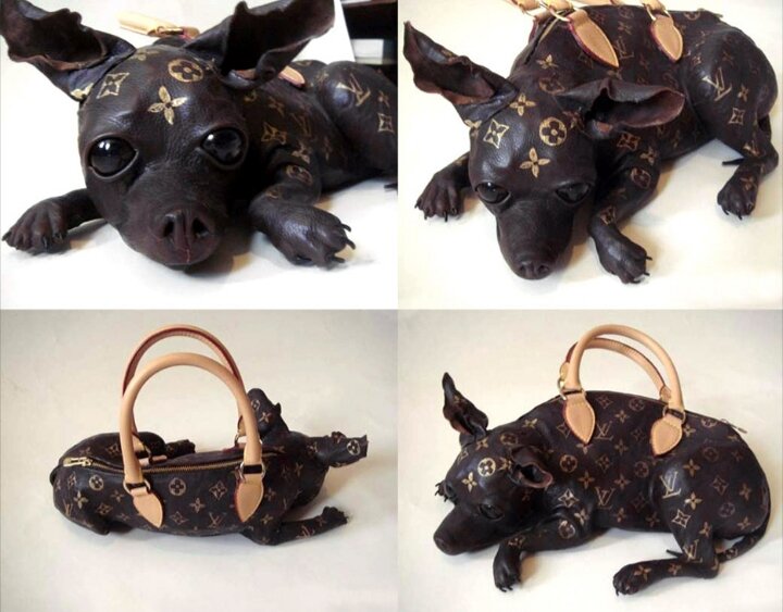 Сумка «Inspired Doggie Bag» от бренда «Louis Vuitton». Это сумочка в форме собачки чихуахуа, которой так и хочется дать имя, например, Бобик или Шарик, настолько она натуралистична. Она была создана в 2008 году для выставки «The Honey Space», участники которой должны были создать оригинальные небольшие сумки, которые можно взять с собой в самолет в качестве ручной клади. Изделие не является официальной моделью от бренда «Louis Vuitton», тем не менее, вся его поверхность покрыта логотипами знаменитого модного дома. До сих пор неизвестно, была ли эта сумка создана «с намеком» на звезд, запустивших моду повсюду носить с собой своих маленьких собачек, или же просто как аксессуар, призванный поражать окружающих.