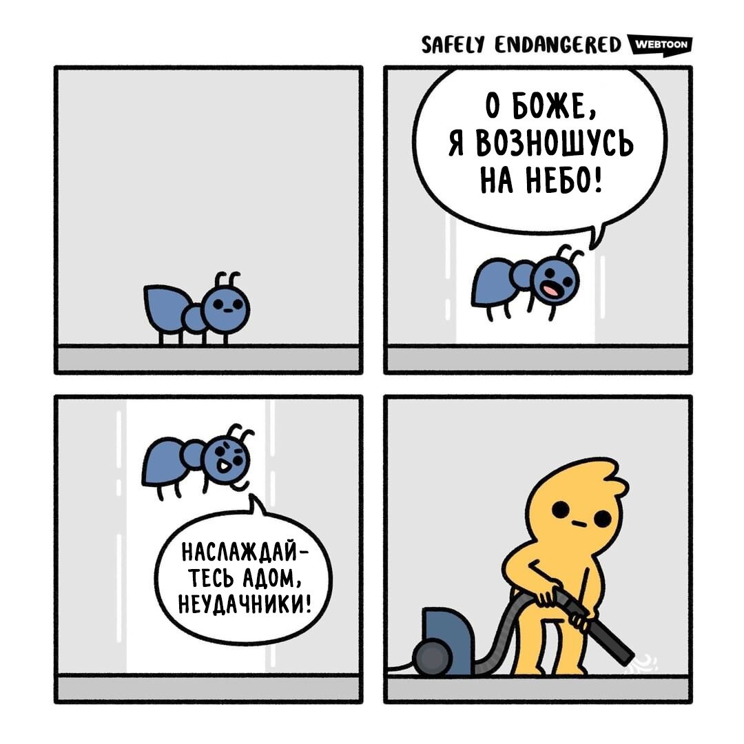 Череда актуальных летних подборок комиксов продолжается - про жару уже было, про отпуск тоже, да даже про футбол, ну а теперь настало время вспомнить еще одну вещь, без которой не обходится летний сезон. Как вы могли заметить из заголовка речь сегодня пойдет о всяческих насекомых. И не только о комарах - не забудем мы и про жучков, забравшихся в квартиру, и про назойливых мух и даже про жужжащих шмелей. Еще в подборке будет кое-что про пауков - хоть это и не насекомые, но думаю, что они сюда тоже отлично впишутся (хоть я уже и предвижу комментарии «ПАУКИ- ЭТО НЕ НАСЕКОМЫЕ» и все в таком роде). В общем, надеюсь, что вам понравится! Ливерпульский иллюстратор Крис Маккой (Chris McCoy) в рамках своей серии комиксов Safely Endangered («Под угрозой исчезновения») никогда не ограничивает себя в выборе тем. Художник рисует и про людей, и про животных, и про насекомых. Ниже - одна из его недавних работ. Питерский художник и аниматор Павел Шишунер является автором творческого проекта Шишуне́р сд