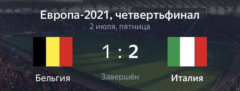 2 июля в 19.00 путевку в полуфинал получила Испания, а в 22.00 Бельгия и Италия приступили к розыгрышу путёвки для себя. В Мюнхене на стадионе «Альянц Арена» завершилась играЕвро-2020 между сборными Бельгии и Италии. Матч закончился победой итальянцев со счетом 2:1. Очень упорным вышло противостояние команд Бельгии и Италии. Первый тайм прошел под давлением итальянцев, бельгийцы же старались ловить своего противника на контратаках. Первый гол итальянцы забили на 13-ой минуте усилиямиБонуччи, однако арбитр при помощи VAR рассмотрел офсайд, и мяч не был засчитан. Скуадра Адзура не перестала оказывать давление, и уже на 31-ой минуте Барелла пробил Куртуа. Свое превосходство итальянцы воплотили во второй мяч на 44-ой минуте матча, отметился Лоренцо Инсинье. Но уже на 45-ой минуте Доку в упорной борьбе с ДиЛоренцо заработал пенальти, который успешно реализовалРомелу Лукаку и сохранил интригу на оставшуюся половину встречи. Второй тайм прошел без голов, хотя моментов было достаточно у каждой