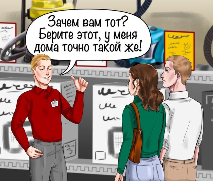 Редкий человек не любит шопинг. Обычно процесс приобретения вещей приносит удовлетворение и радость, но, наверное, у каждого из нас был и негативный опыт, и это зачастую никак не связано с качеством товара. Бывает так, что из-за одной-единственной фразы продавца хочется поскорее уйти из магазина. Больше всего нас, покупателей, раздражают грубость и бестактность продавцов-консультантов. Мы любим хороший сервис, а потому собрали фразы, отпугивающие клиентов, которые сами слышали в магазинах. И надеемся, что наша иллюстрированная подборка внесет свою лепту в улучшение качества обслуживания. А в бонусе мы расскажем, как некоторые продавцы умудряются нахамить, не произнося ни одной фразы. 1. Без сомнения, нам очень интересно, какая техника имеется дома у продавца, ведь у нас одинаковые нужды и вкусы. Всем давно известно, что это распространенный приемчик продавцов-консультантов, особенно в магазинах бытовой техники. Сегодня он утверждает, что уже несколько лет чистит пол «вот этим пылесосо