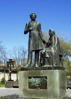 / «Няне», 1826/ А в подмосковном музее-заповеднике Захарово - Большие Вяземы есть вот такая скульптурная композиция - маленький Александр и его бабушка Мария Алексеевна Ганнибал. Евгений Онегин - герой, занимавший немалое место в жизни Александра Сергеевича, но существовавший лишь на страницах его романа, разделил со своим создателем памятник в Йошкар-Оле. Скульптура, созданная Андреем Ковальчуком в сентябре 2011 года, изображает задумчивого поэта, сидящего на скамье, и стоящего рядом Онегина. Если говорить о Пушкинских местах, то нельзя не поклониться могиле поэта в Святогорском монастыре. Лаконичный обелиск хранит память о Пушкине с 1841 года, несколько раз он ветшал, пострадал в 1918 и чудом сохранился в годы Вели