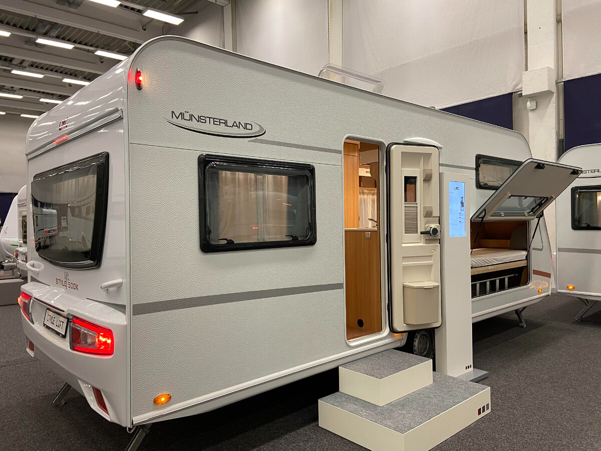 Сегодня в обзоре действительно интересный дом на колёсах для путешествий и отдыха большой семьи с детьми. Количество спальных мест может быть до 7. LMC Style Lift 500 K Основные характеристики Важная особенность модели - высота потолка 208 см. В основной гостиной получилось спроектировать и поставить опускаемую кровать, которая увеличивает количество спальных мест до семи. Обычно, такие варианты мы встречаем в самоходных автодомах, но и прицепы, как видно - не исключение. Кровать опускается по рельсам, а в дневное время надежно фиксируется в верхнем положении. Есть мнение, что опускаемые кровати в прицепах не очень хорошая идея для эксплуатации в России. Говорят, что конструкция разваливается. К сожалению, на данный момент, у нас нет достоверных данных о пользовательском опыте по данной модели. Размеры кроватей Детская половина прицепа выглядит интереснее основной гостиной. Тут есть столик, шкаф, много подвесных полок. Детская столовая группа раскладывается и тут можно оборудовать еще