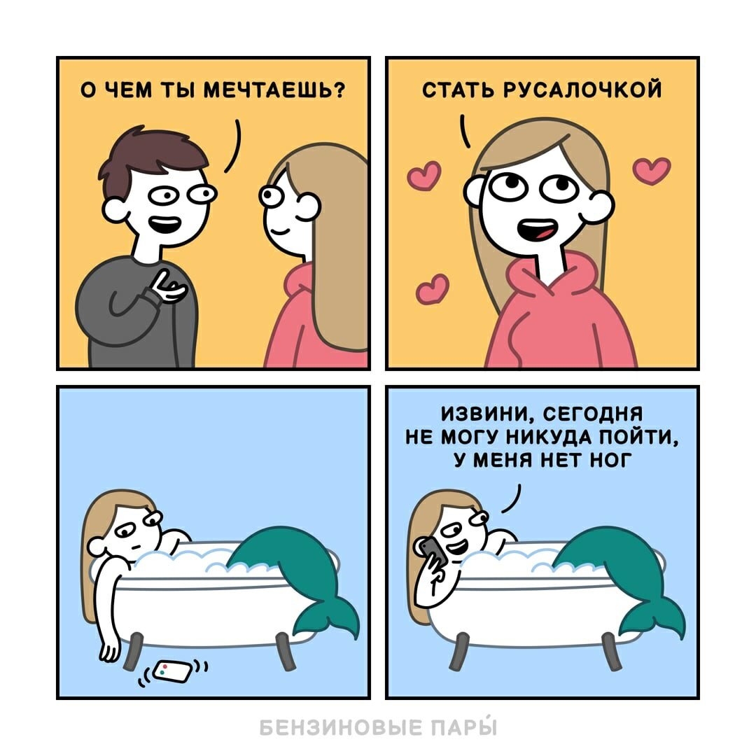 Однажды я сделаю подборки комиксов про всех более-менее известных сказочных и мифических существ в этом блоге, но пока до этого далеко я продолжу вспоминать все новых и новых вымышленных персонажей. К примеру, сегодня речь пойдет о русалках - причем не только тех, которых вы могли видеть в диснеевском мультике, а в целом о девушка с рыбьим хвостом вместо ног. Как обычно авторы в сегодняшней подборке будет самые разные - как российские, так и зарубежные, а все потому, что образ морской девы известен и узнаваем по всему миру. Впрочем, юмор здесь будет тоже самый разнообразный - от милого до черного, так что, надеюсь, каждый читатель сможет хоть над чем-нибудь посмеяться. Российский художник Евгений Зелёный уже давно занимается комиксами, поэтому, что называется, успел набить в этом руку. В рамках его проекта под названием БЕНЗИНОВЫЕ ПАРЫ регулярно выходят юмористические стрипы - один смешнее другого. Темы для шуток в упомянутой серии всегда самые разные - вот и про русалок кое-что нашлос