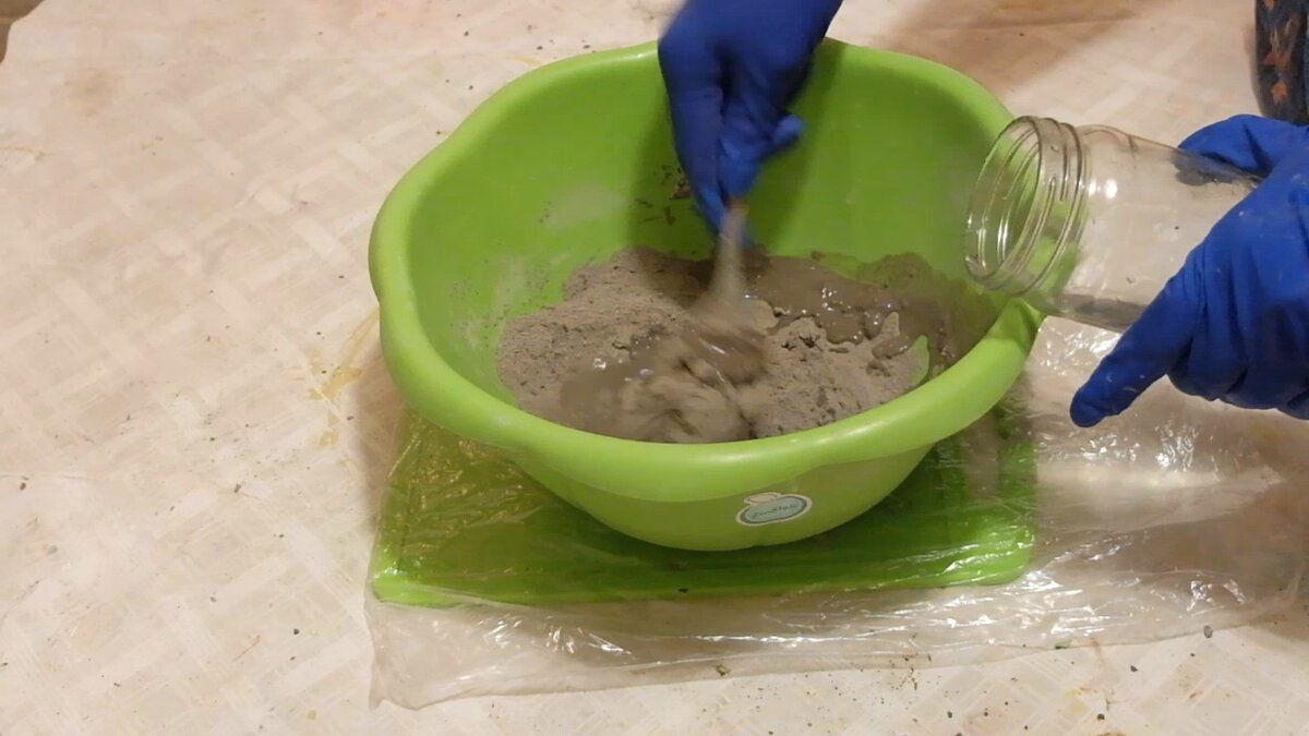 Смешиваю 2 части песка и 1 часть цемента, добавляю 2 столовых ложки клея ПВА и воду. Раствор должен получится не очень густой. Клей ПВА необходим для увеличения пластичности массы.