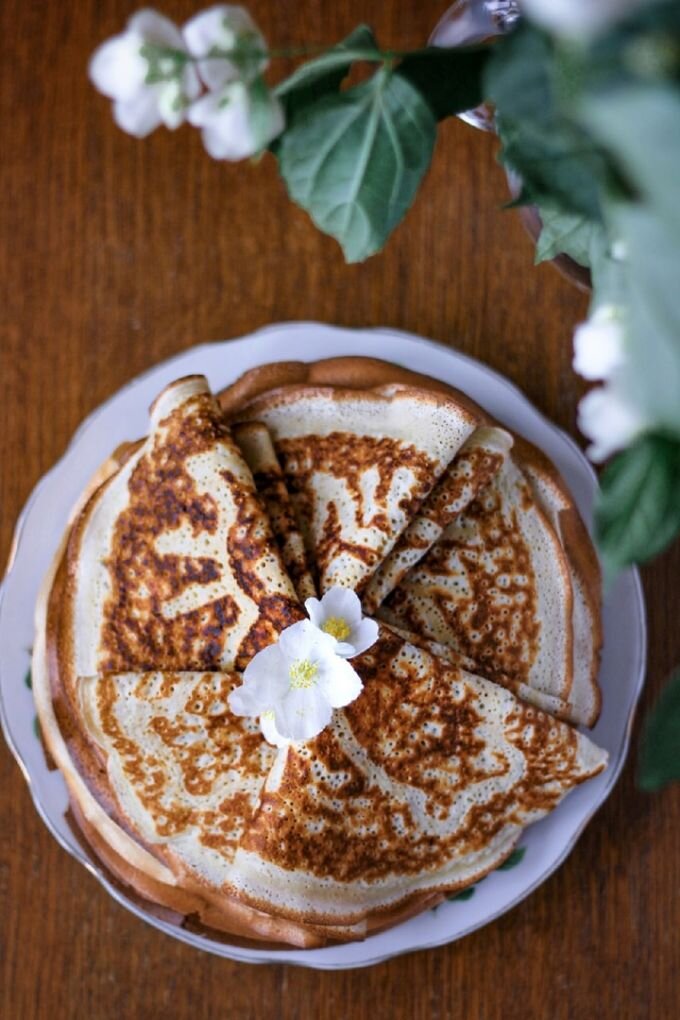 Такие блины можно и просто смазать сливочным маслом и посыпаться сахаром! Это очень вкусно! Вам понадобится 1. Яйца СО - 4 штуки 2. Молоко 3,2% - 950 мл 3. Мука - 500 грамм 4. Сахар коричневый - 4 ст.л. 5. Соль - щепотка 6. Растительное масло - 2 ст.л. 7. Сливочное масло - для жарки Инструкция 1. Подготовить все ингредиенты заранее, они все должны быть комнатной температуры. Сливочное масло может быть из холодильника, так как мы его используем только для жарки. 2. Яйца соединить с сахаром и солью. Взбить до увеличения в объеме в 2-3 раза. Смесь должна стать кремово-белой, воздушной и опадать с венчика красивой лентой, ни в коем случае не стекать! Если стекает, то нужно еще взбивать. 3. Переключаем миксер на минимальную скорость и начинаем вводить молоко. Делаем это постепенно, хорошо размешивая. Как влили все молоко,