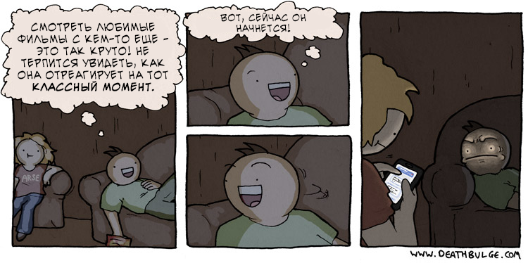 Deathbulge (от англ. слов «death» - «смерть» и «bulge» - «выпуклость») - это серия юмористических веб-комиксов, созданная английским художником Дэном Мартином (Dan Martin). Серия стартовала в 2012 году на сайте проекта, кроме того, автор выкладывает свои комиксы в различных соцсетях вроде Инстаграма, Фейсбука и Твиттера. Многие комиксы из серии Deathbulge становились популярными в сети, а какие-то даже превращались в мемы, так что вы наверняка могли натыкаться на творчество Дэна Мартина и раньше.