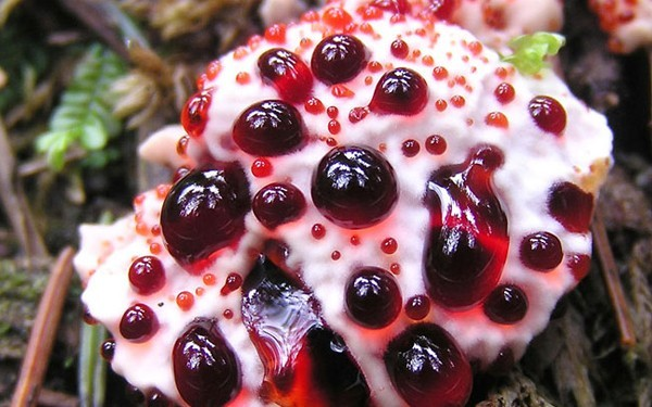 Ядовитый гриб «Кровавый зуб» на латыни (Hydnellum peckii). Такое название гриб получил из-за своего внешнего вида! На поверхности гриба образовывается красно-багряная жидкость. При первом взгляде складывается впечатление что это какой-то раненый зверь обрызгал гриб своей кровью.