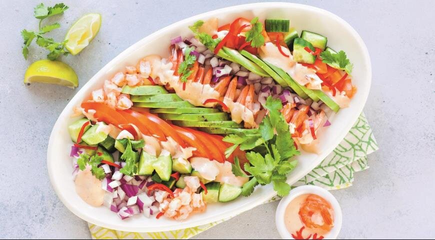 - В конце 90-х, когда у нас в магазинах впервые появился невиданный фрукт авокадо, стал очень популярен салат из авокадо с креветками. Этот салат, состоящий из креветок, авокадо и иногда яйца, подавался в половинках авокадо. Мы решили изменить рецепт этого салата с учетом современных тенденций.