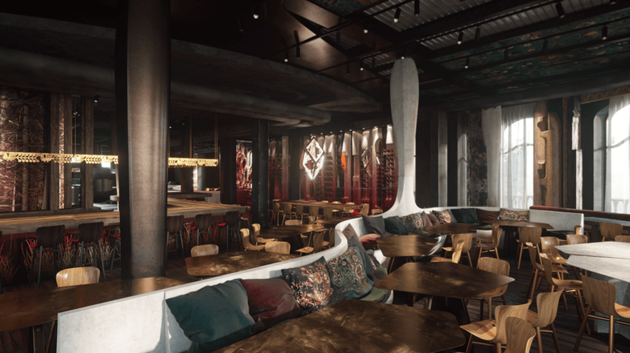Выглядит «Горыныч» весьма атмосферно: темный индустриальный интерьер, билибинские росписи на стенах, геометрические лампы под потолком, кухня открытого огня.