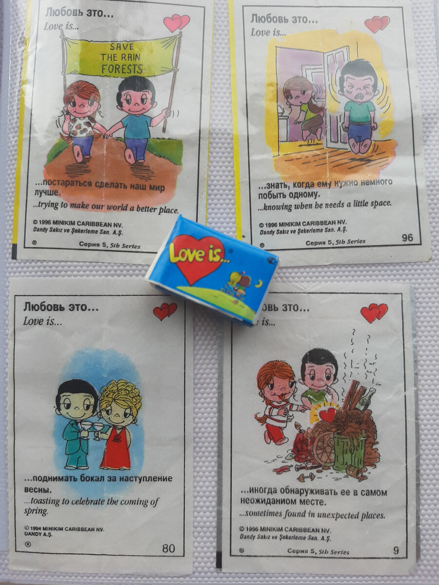 В детстве первые советы об отношениях мы получили не только из сериалов, но и благодаря жевательной резинке :) Яркие вкладыши с философскими изречениями или смешными сценками о любви не могли оставить равнодушной почти ни одну девчонку (не зря жевачка "Love is" считается одним из символов "детства 90-х"). У меня вот даже маленькая коллекция сохранилась. Милые картинки появились в 1960-х годах благодаря истории любви девятнадцатилетней новозеландской художницы Ким и итальянского программиста Роберто Касали. Они познакомились в Лос-Анжелесе и начали встречаться. Ким рисовала возлюбленному романтические послания с милыми пупсами, похожими на них. Влюблённые поженились, а картинки появились на свет (5 января 1970 года) в виде комикса, опубликованного в журнале "Los Angeles Times". Потом рубрика стала еженедельной. Комиксы обрели большую популярность, и супруги открыли собственную компанию "Minikim". Теперь полюбившиеся герои стали появляться на календарях, футболках и кружках... К середин