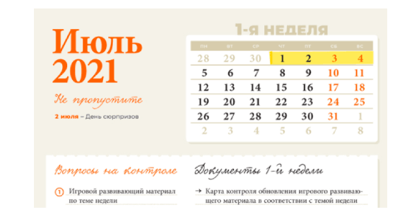 Воспользуйтесь готовой циклограммой на июль. В ней девять вопросов, на которые важно обратить внимание в этом месяце. В июле проконтролируйте, что воспитатели планируют делать с детьми на прогулках, как организуют утреннюю зарядку и подвижные игры, какие проводят целевые прогулки и экскурсии. Еще один вопрос контроля – как педагоги организуют изобразительную деятельность воспитанников. Тематический контроль посвятите организации питания детей. Заберите циклограмму на июль на портале Ресобр.ру. Подпишитесь на канал, чтобы не пропустить новые публикации.