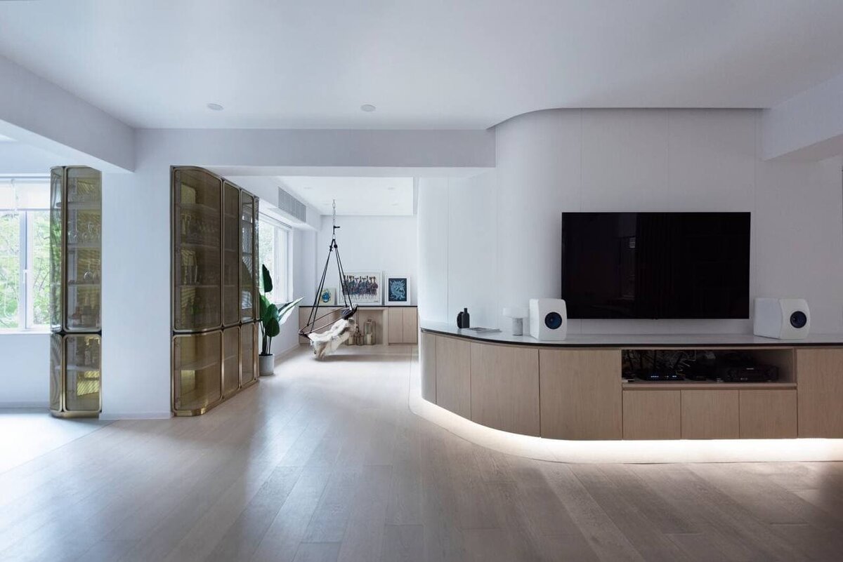 Вдохновленная окружающей топографией дизайнерская фирма Bean Buro разработала каскадный эффект в архитектуре: горизонтальные формы плавно переходят из одного пространства в другое, создавая безмятежный поток в интерьере. Bean Buro стремилась максимально использовать естественный свет и виды (из каждого окна видна впечатляющая панорама), исследуя различные пространственные подходы к размерам комнат и хранению в них. Комнаты спроектированы с учетом окружающего здание пейзажа. Так, дизайнеры разместили светлый уголок для чтения с подвесным стулом, обращенным к окну. Подобный подход к подбору палитры интерьера отражен в длинных досках и дубовых полах в елочку, латунной отделке и сделанном на заказ обеденном столе из дерева и камня. «Мы сохранили нейтральную палитру материалов, чтобы максимально усилить поэтические качества дневного света», — говорит Лорен Фор, соучредитель Bean Buro. В апартаментах открытой планировки есть основная спальня с ванной комнатой, гостевая спальн