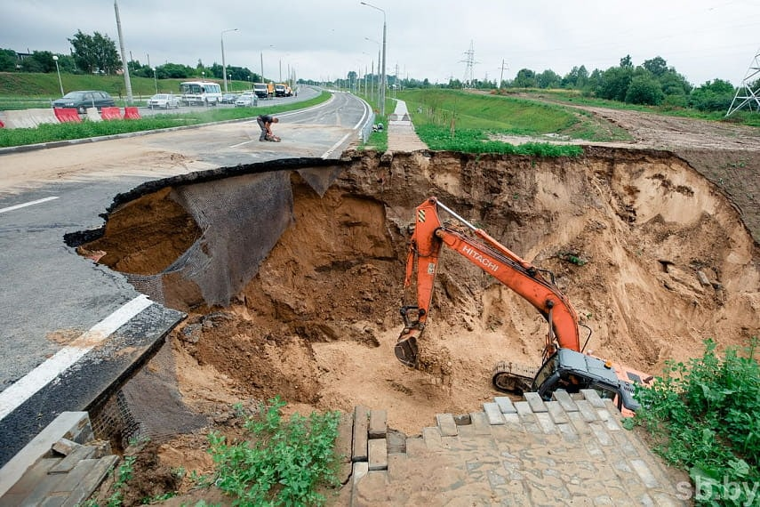 🚜 Будет проведено уплотнение грунта - официальный ответ по ситуации с новым мостом. Провал на объездной после ливней оказался серьезным: рухнул фонарный столб, тротуар и часть нового асфальта. Комментирий председателя Гродненского облисполкома: «Учитывая, что здесь самая низкая точка дороги, здесь действительно скапливается вода, будут организованы лотки для аварийного сброса воды и склоны укреплены геосеткой, чтобы они могли противостоять ливням ещё до того, как укрепится дёрн. Я думаю, все мероприятия, которые оцениваются в 7-10 дней, позволят не только устранить повреждения, но и сведут к нулю риск повторения в будущем».