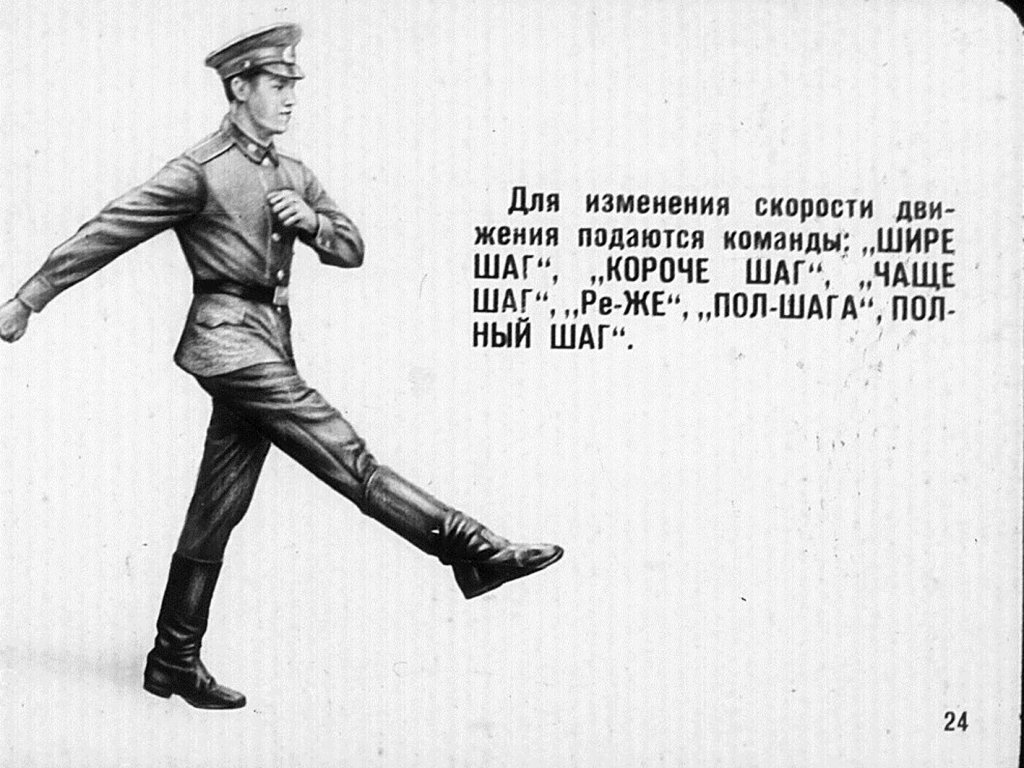 По всякой предварительной команде военнослужащие, находящиеся в строю и вне строя на месте, принимают положение «смирно», а находящиеся в движении ногу ставят тверже.