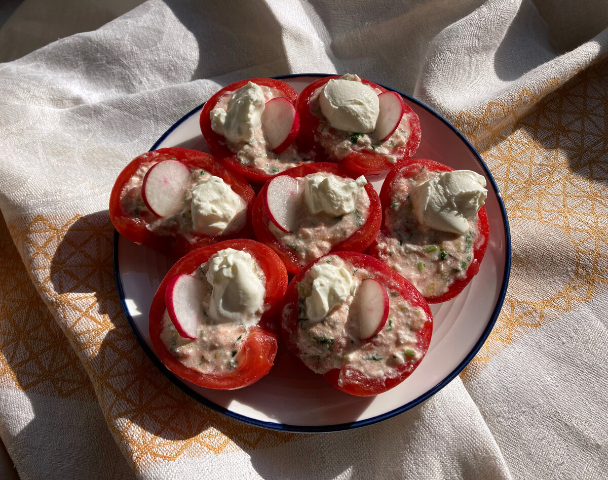 Я оооооочень люблю готовить. Ну, вы, наверное, догадываетесь... Но иногда даже мне готовить ну вот совершенно не хочется, нет на это ни сил, ни времени, ни ресурса. В этом случае у меня есть для вас хорошая новость - сейчас лето! Сейчас есть сезонные овощи, в которых есть вкус, запах и витальная энергия. Их как-то особенно готовить - только портить. Как, например, эти сладкие рыночные помидоры. И эта душистая зелень с соседнего прилавка. Вы видите, что от укропа и петрушки я беру только листики, а кинзу использую целиком, со стеблями, потому что они очень нежные. Режу зелень мелко, беру один-два зубчика свежего молодого чесночка, сочного, как яблоко, и соль. Растираю зелень и чеснок с солью прямо на доске. Смешиваю с соком и мелко порубленными внутренностями помидоров. В получившийся соус добавляю творог. По вашему желанию это может быть и сливочный сыр, например. Если хотите, можно сделать эту массу однородной с помощью блендера. Но мне, если творог хороший, нежный, нравится оставить