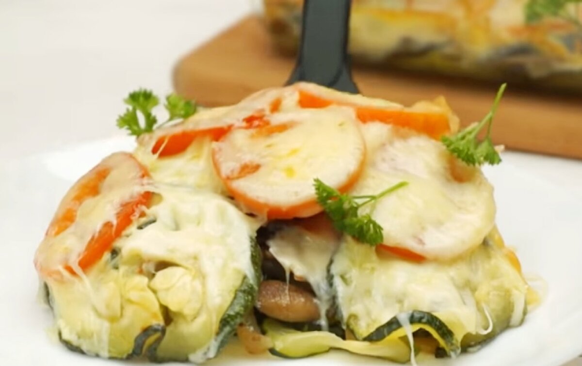 - На кабачки выложить жареные грибы с луком и равномерно их распределить. Сверху выложить оставшиеся кабачки